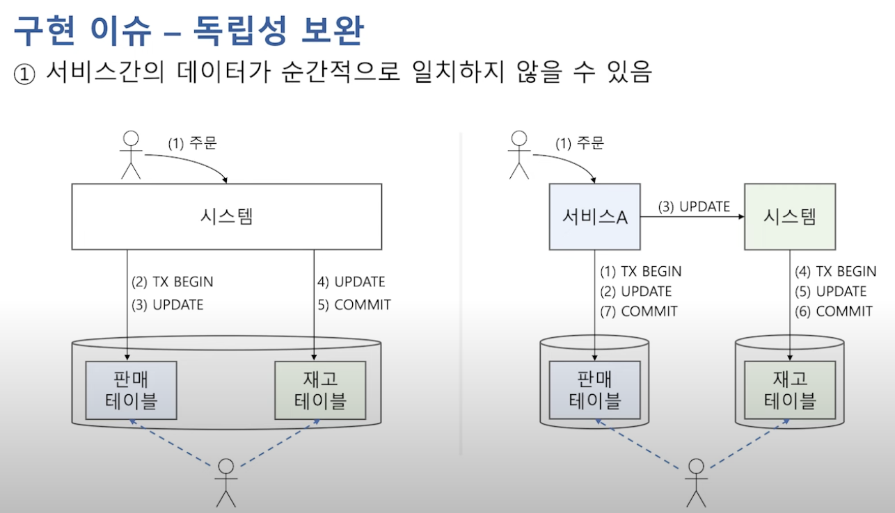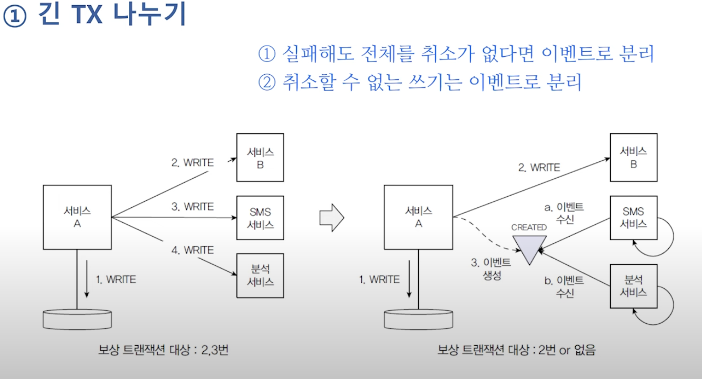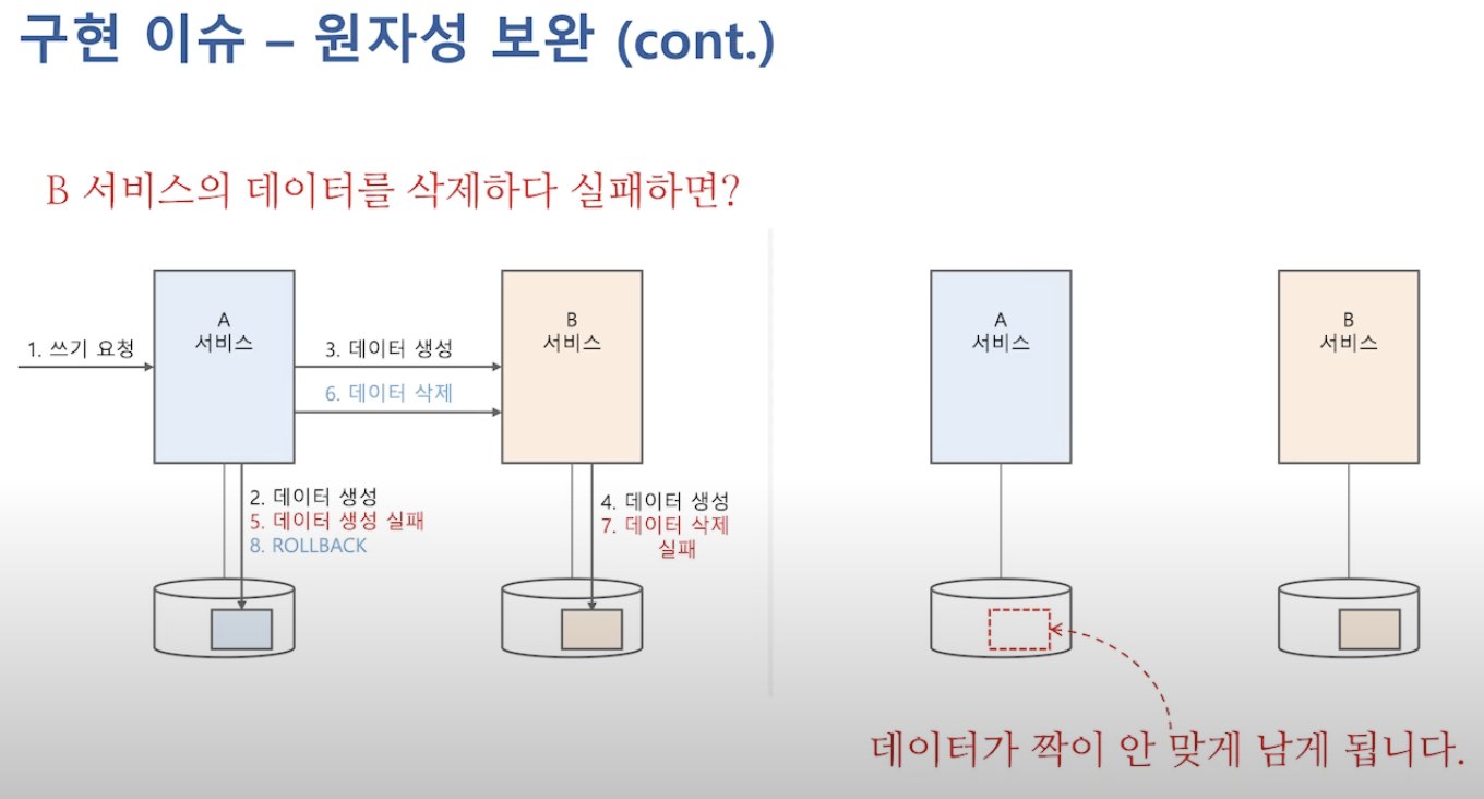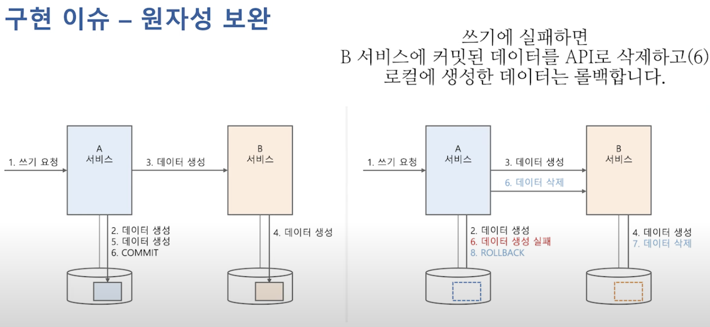 모놀리식의 경우 중간단계에서 쓰기가 실패했을때 롤백이 되겠지만