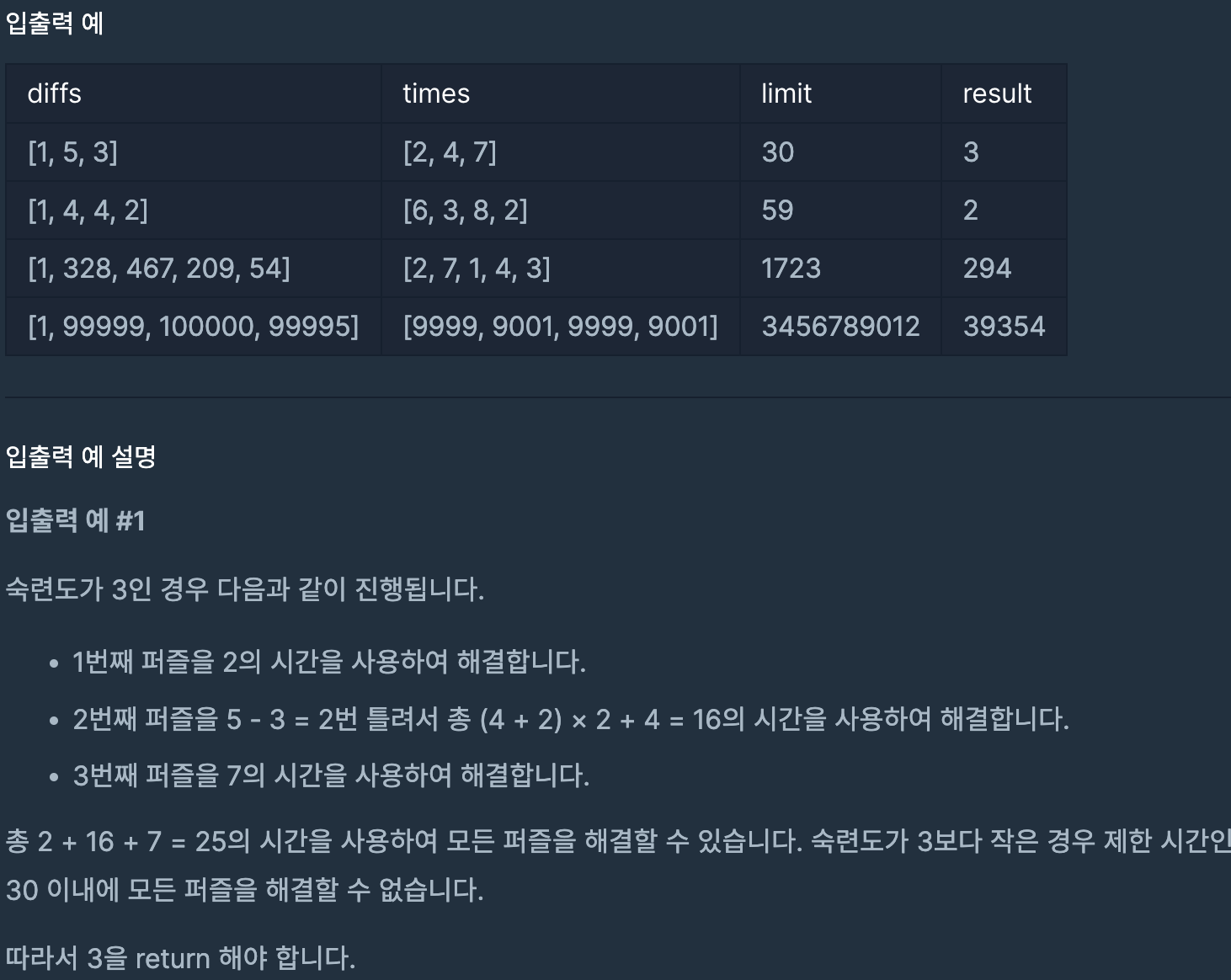 퍼즐 게임 챌린지문제 설명당신은 순서대로 n개의 퍼즐을 제한 시간 내에 풀어야 하는 퍼즐 게임을 하고 있습니다. 각 퍼즐은 난이도와 소요 시간이 정해져 있습니다. 당신의 숙련도에 따라 퍼즐을 풀 때 틀리는 횟수가 바뀌게 됩니다. 현재 퍼즐의 난이도를 diff, 현재 퍼즐의 소요 시간을 time_cur, 이전 퍼즐의 소요 시간을 time_prev, 당신의 숙련도를 level이라 하면, 게임은 다음과 같이 진행됩니다.diff ≤ level이면 퍼즐을 틀리지 않고 time_cur만큼의 시간을 사용하여 해결합니다.diff > level이면, 퍼즐을 총 diff - level번 틀립니다. 퍼즐을 틀릴 때마다, time_cur만큼의 시간을 사용하며, 추가로 time_prev만큼의 시간을 사용해 이전 퍼즐을 다시 풀..